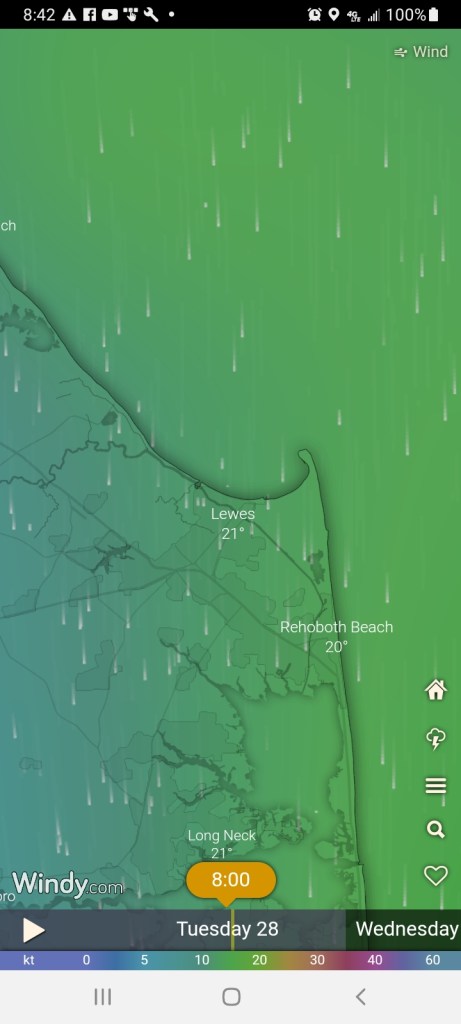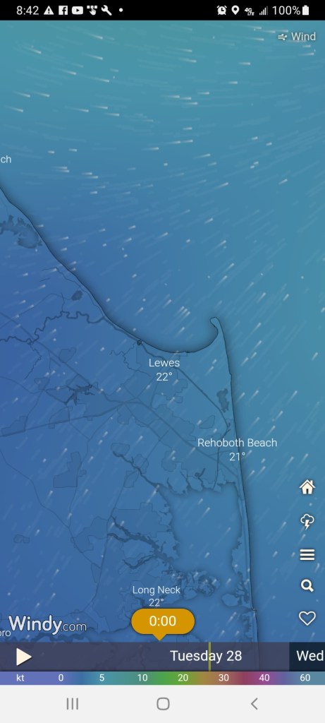 Shortly after taking up shelter behind Cape Henlopen the forecast predicted strong winds from North at midnight, my once protected anchorage was about to get rough.