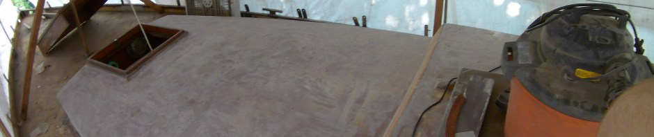 The new roof consists of 2 layers of 6mm marine plywood laminated together, and firmly cemented to the cabin trunk, with thickened West System epoxy. The two layers were then sheathed in a layer of 10 oz fibreglass cloth set in epoxy once again. The roof was then faired with subsequent coats of West System. 132 stainless screws fasten each layer to one an other, and to the oak frames and mast step.